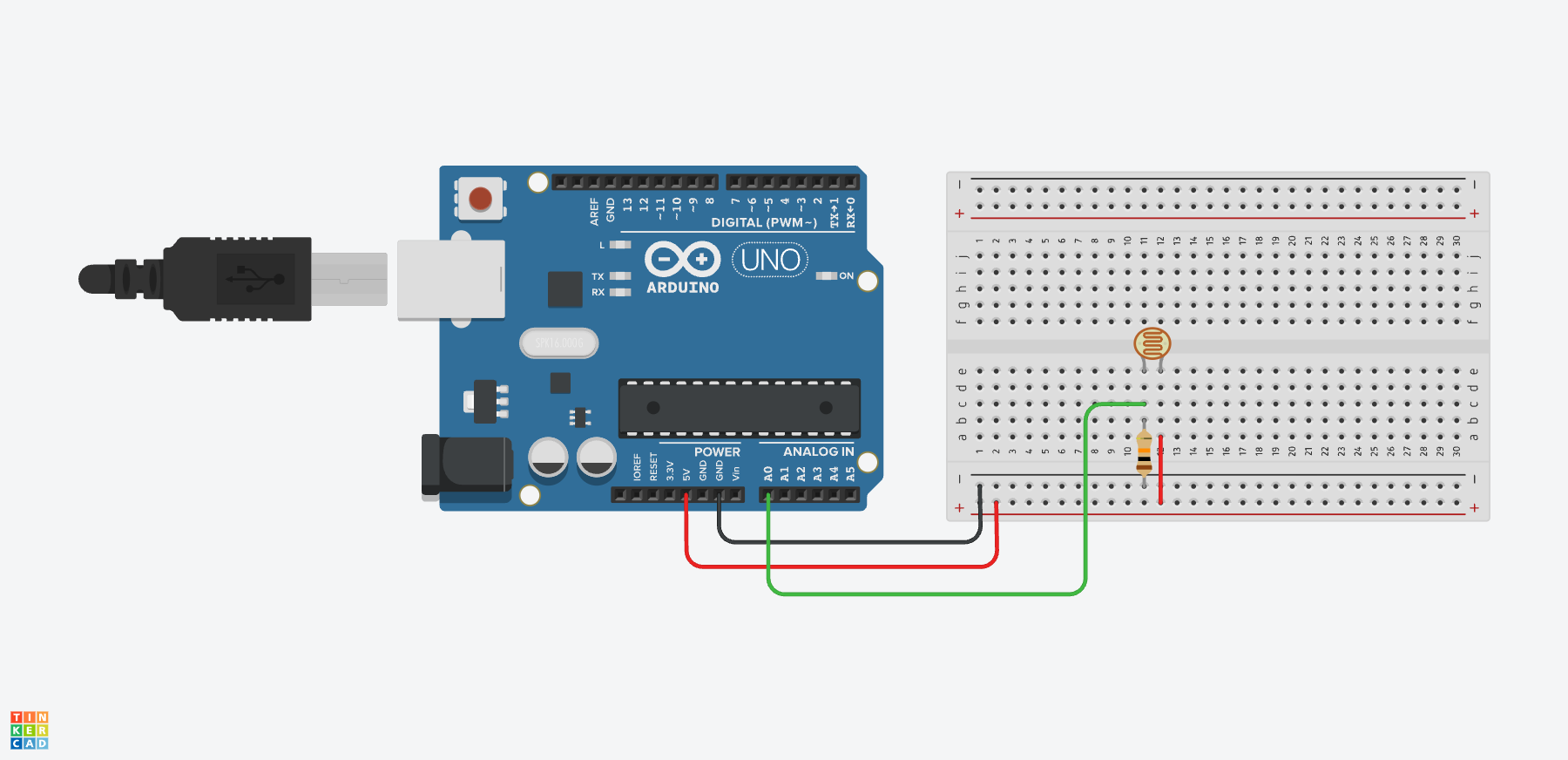 Een potmeter aflezen is leuk maar we willen ook met sensoren werken. Sluit een lichtsensor (LDR) aan volgens tekening hieronder. Nu wordt een echte sensor gebruikt. We meten!