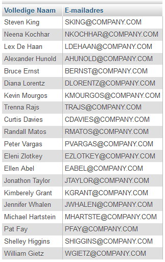 Maak een overzicht met de volledige namen en de e-mailadressen eindigend op @COMPANY.COM van de tabel employees. Let op de kolomnamen.