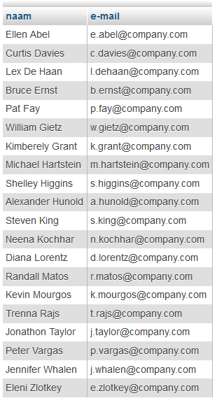 Maak een overzicht met de namen van de werknemers en hun nieuwe e-mailadressen zoals in onderstaand overzicht. Als er een spatie in de naam staat (zoals bij 'De Haan'), zal die spatie uit de naam moeten worden gehaald. Alles staat in kleine letters en het e-mailadres bestaat uit de eerste letter van de voornaam, gevolgd door een punt en daarna de achternaam met daaraan vastgeplakt de bedrijfsnaam. Er is gesorteerd op achternaam.