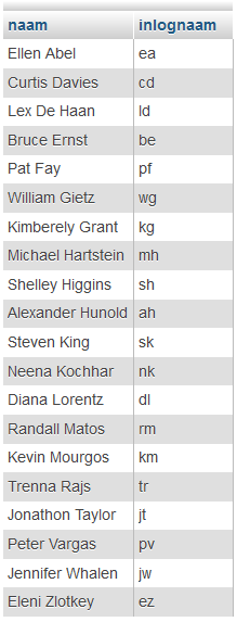 Om in te loggen maken de werknemers gebruik van een inlognaam die bestaat uit de eerste letter van de voornaam en de eerste letter van de achternaam, aan elkaar en in kleine letters. Maak een overzicht van de inlognamen en sorteer op de achternaam.