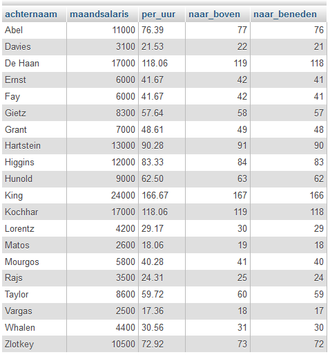 Maak een overzicht van de salarissen zoals in onderstaand overzicht. In de tweede kolom staat het maandsalaris afgerond op nul decimalen. Uitgaande van een 36 urige werkweek en vier weken in een maand staat dan in de derde kolom wat zo'n werknemer per uur verdient in twee decimalen. In de vierde kolom is dat naar beneden afgerond en in de vijfde kolom naar boven. Er is gesorteerd op achternaam.