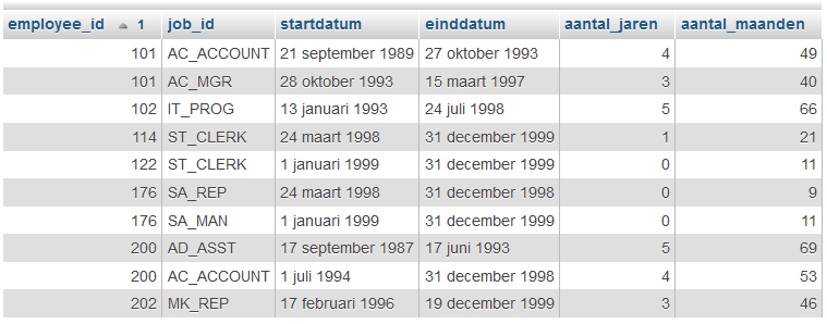 Maak een overzicht zoals hieronder. De gegevens komen uit de tabel job_history. De datums zijn in het Nederlands (maanden met een kleine letter bijvoorbeeld) en er is geen voorloopnul gebruikt bij de dag (geen 01 januari maar 1 januari bijvoorbeeld). Er is gesorteerd op employee_id.