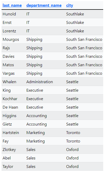 Nog een voorbeeld van employees die het minimum salaris hebben van de job_id die ze hebben. De tabellen employees en jobs worden samengevoegd op kolommen die niet dezelfde kolomnaam hebben. Merk op dat salary twee decimalen heeft en dat min_salary en max_salary geen decimalen hebben. De kolom salary is van het type DECIMAL en de kolommen min_salary en max_salary zijn van het type INT.