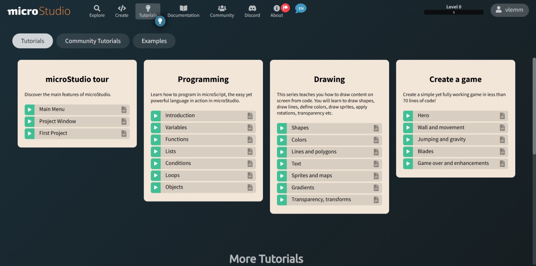 - Klik in het menu op Tutorials of ga naar https://microstudio.dev/tutorials/.