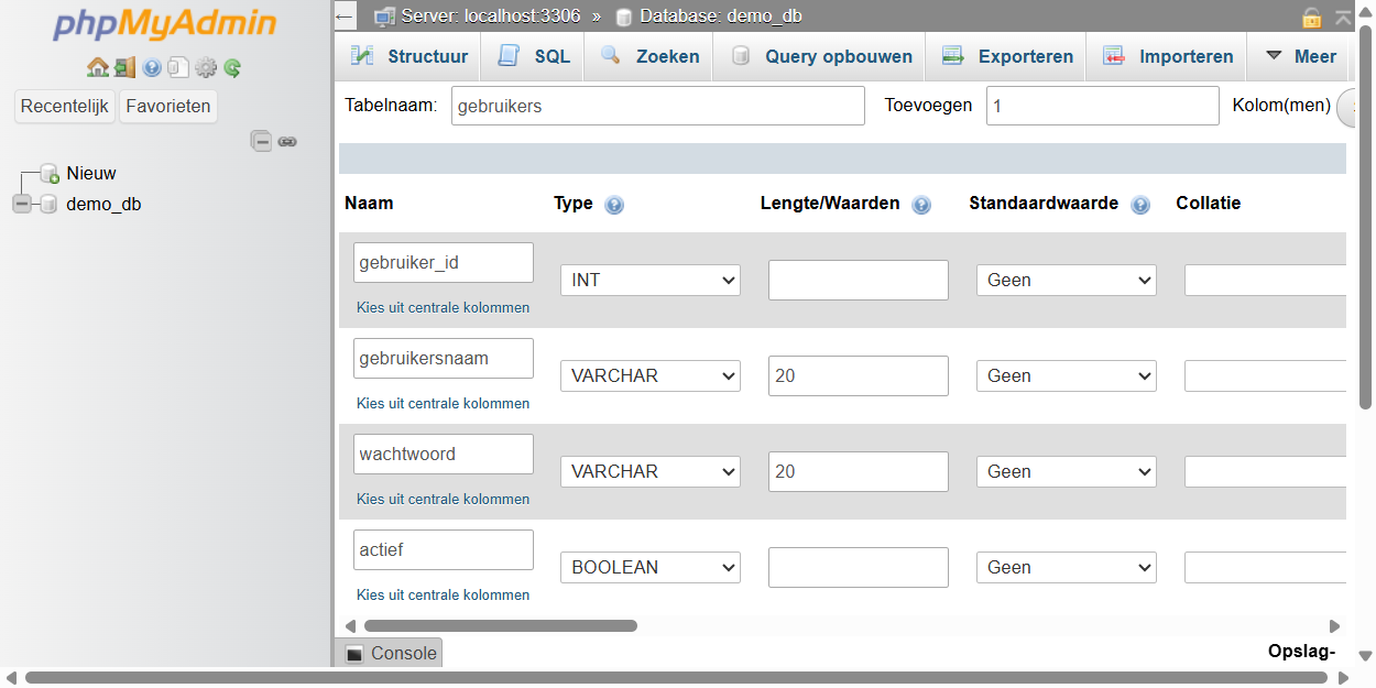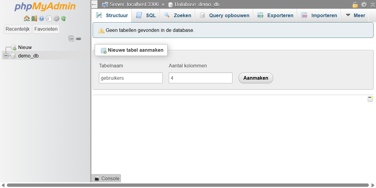 Voer bij Tabelnaam gebruikers in en bij Aantal kolommen 4. Klik op Aanmaken.